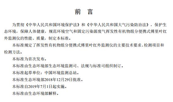 生態(tài)環(huán)境部首次發(fā)布了環(huán)境空氣和廢氣揮發(fā)性有機物組分便攜式傅里葉紅外監(jiān)測儀技術(shù)要求及檢測方法,此標準于2019年7月1日實施。全文如下: