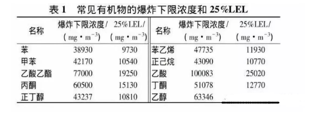 由于溫度的提高會降低有機物爆炸下限濃度,通常要控制廢氣進口濃度<25%LEL,常見有機物的爆炸下限和25%LEL如表1。