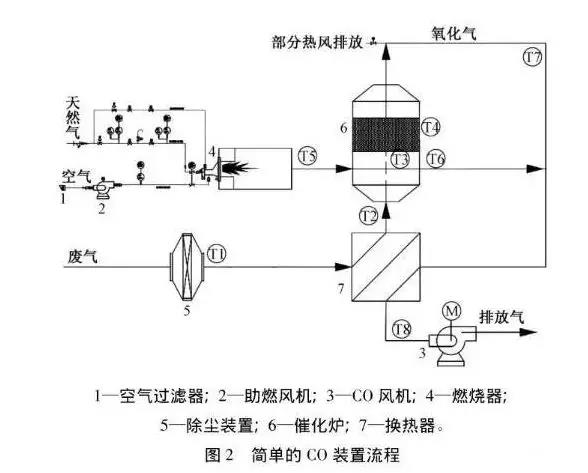 廢氣如果進口濃度過高,可進風稀析,稀析閥與氧化氣溫度連鎖;廢氣進口濃度如果為2130~3130mg/m3,可用電或燃氣提升廢氣進催化劑層的溫度達到催化起燃溫度250℃;廢氣進口濃度如果<2130mg/m3,可吸附濃縮后再用CO處理脫附出的濃縮氣;如果廢氣初始溫度較高,比如很多烘箱廢氣有80℃,此時CO能處理的廢氣濃度可以相應降低到1560mg/m3。
