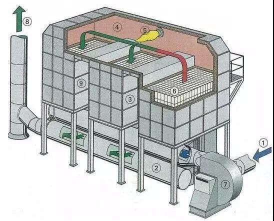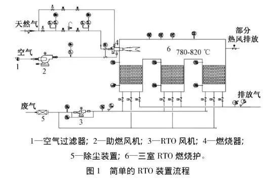 2)RTO的燃燒方式與TO相同,只是將換熱器改為蓄熱陶瓷,高溫燃燒氣與新進廢氣交替進入蓄熱陶瓷直接換熱,熱量利用率可提高到90%以上,理念先進,運行成本較低,是目前國家主推的廢氣治理工藝。