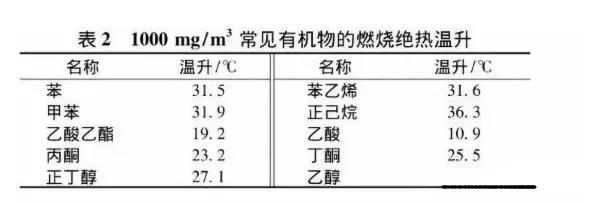 有機物氧化分解會放出大量熱量使得廢氣溫升,計算1000mg/m3的常見廢氣有機物絕熱溫升如表2。