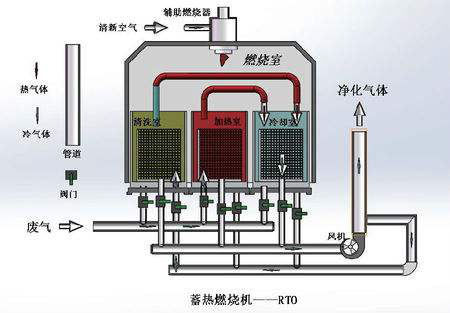 蓄熱式燃燒法(Regenerative Thermal Oxidizers,RTO)是燃燒處理技術(shù)之一,其原理是在一定溫度(一般≥760℃)作用下將污染物完全氧化,去除效率可達(dá)99%以上。此技術(shù)是用多床可蓄熱材質(zhì)的蓄熱室進(jìn)行蓄熱與氧化互相切換的方式,以大幅減少熱量的損耗。RTO的熱回收效率可高達(dá)90%以上,具有凈化效率高、運(yùn)行費(fèi)用低的特點(diǎn)。