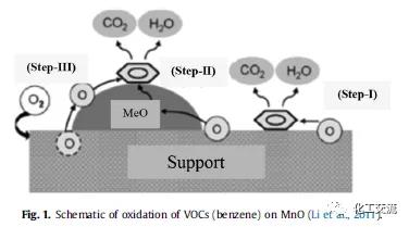 氧化銅也是一種對CO,甲烷,甲醇,乙醇和乙醛進行深度氧化的高活性催化劑。催化劑中Cu的價態(tài)決定了氧化反應的機理。催化劑表面的晶格氧也起著重要的作用,隨著表面晶格氧的消耗,晶格氧擴散到催化劑表面成為反應的限制步驟。CuO負載在Al2O3極大的加強了分解效率,能夠脫氫和氧化很多種VOCs。