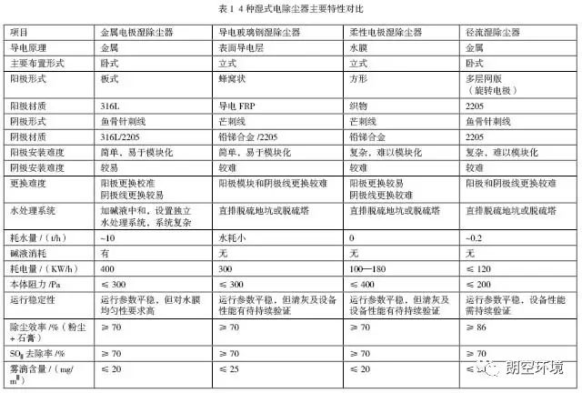 上述4種濕式電除塵器是目前國內(nèi)燃煤電廠普遍采用的高效除塵的終端精處理設(shè)備,其主要特性對比結(jié)果如表1所示(以300MW機組為例,數(shù)據(jù)僅供參考)。
