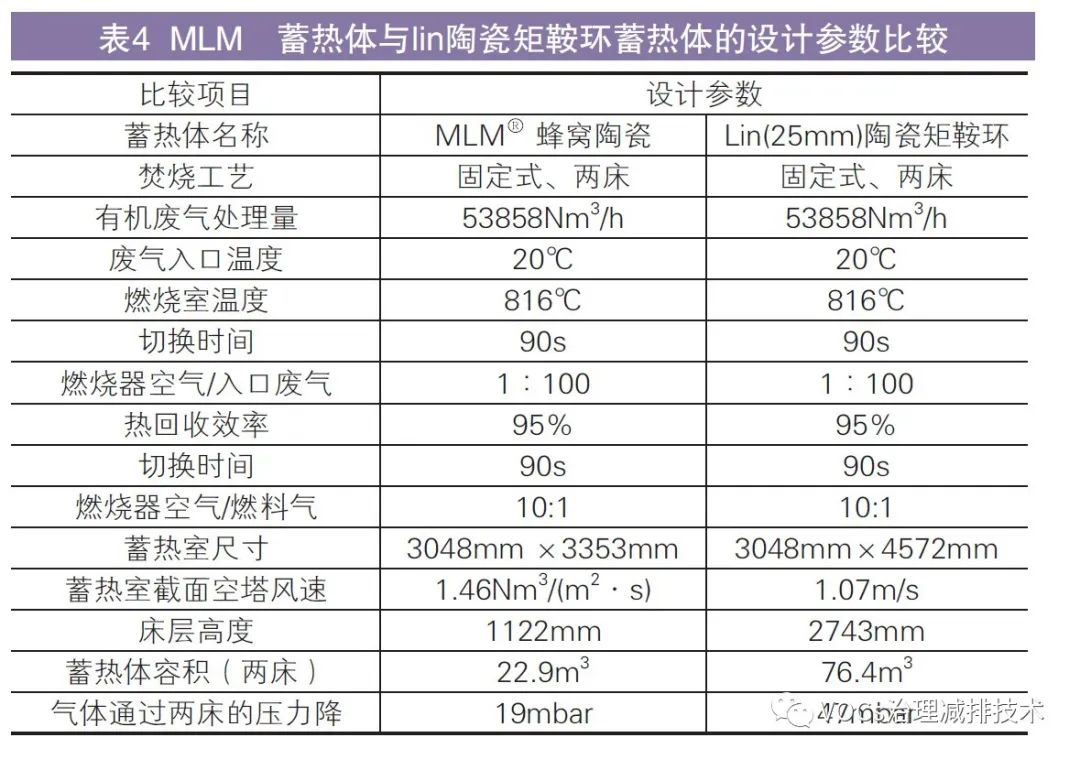 美國藍太克產(chǎn)品有限公司將MLM®蓄熱體用于RTO的設計參數(shù)與lin陶瓷矩鞍環(huán)的進行了比較,如表4所示。