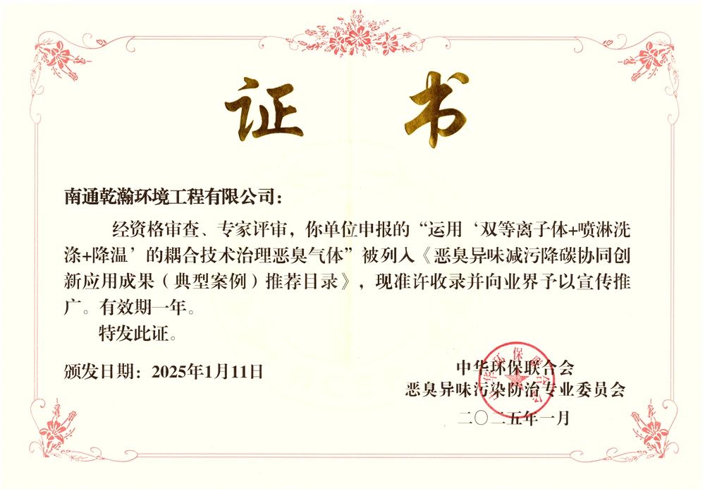【科技賦能 助力環(huán)?!磕贤ㄇ谥腥A環(huán)保聯(lián)合會(huì)惡臭異味污染防治專業(yè)委員會(huì)成立大會(huì)上,獲得中華環(huán)保聯(lián)合會(huì)典型案例推薦目錄證書(shū)