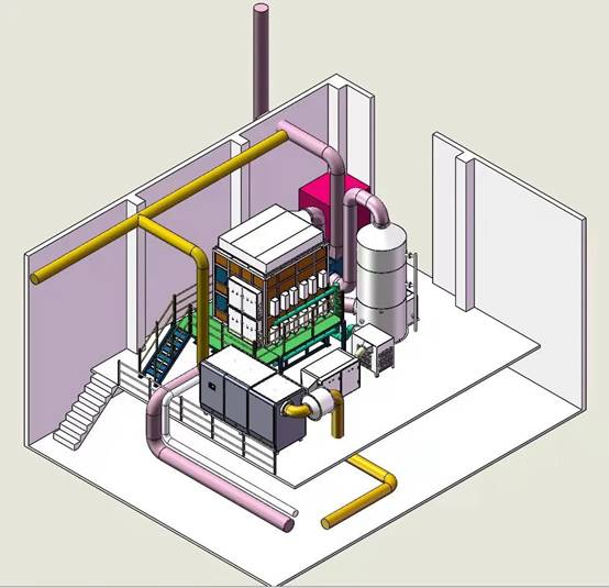 1、經收集后的廢氣進入“電暈放電+雙介質阻擋放電的低溫等離子體”組合式凈化設備,通過兩種等離子體設備協(xié)同去除惡臭、顆粒物等污染物分子。