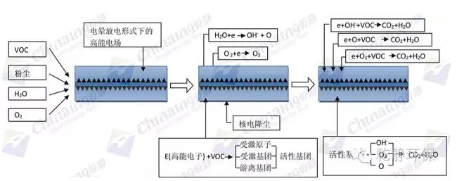 當(dāng)放電過程中電子溫度很高,但重粒子溫度很低時(shí),整個(gè)體系呈現(xiàn)低溫狀態(tài),所以稱為低溫等離子體。低溫等離子體降解污染物是利用這些高能電子、自由基等活性粒子氧化廢氣中的污染物,使污染物分子在極短的時(shí)間內(nèi)發(fā)生分解,并發(fā)生后續(xù)的各種反應(yīng)以達(dá)到降解污染物的目的。