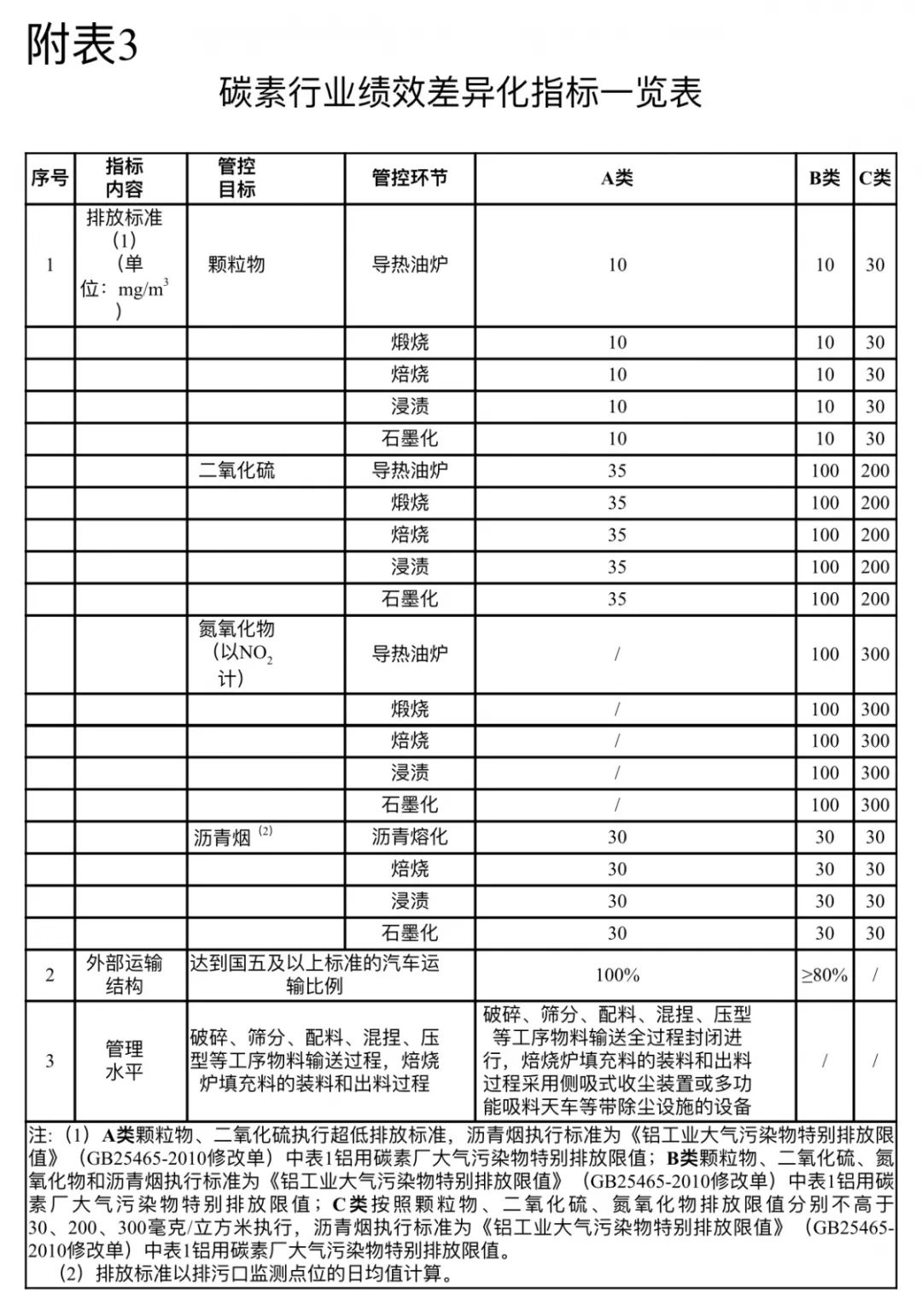 B類: 完成特別排放改造并通過驗收,所有污染物穩(wěn)定達(dá)到《鋁工業(yè)大氣污染物特別排放限值》(GB25465-2010修改單)中表1鋁用碳素廠大氣污染物特別排放限值;新能源汽車或國五及以上標(biāo)準(zhǔn)的汽車運輸比例達(dá)到80%及以上。達(dá)到該類目標(biāo)的生產(chǎn)線,錯峰不低于20%(以實際生產(chǎn)線或設(shè)備數(shù)量為基數(shù),采取生產(chǎn)線計或區(qū)域統(tǒng)籌輪流停產(chǎn),下同)。