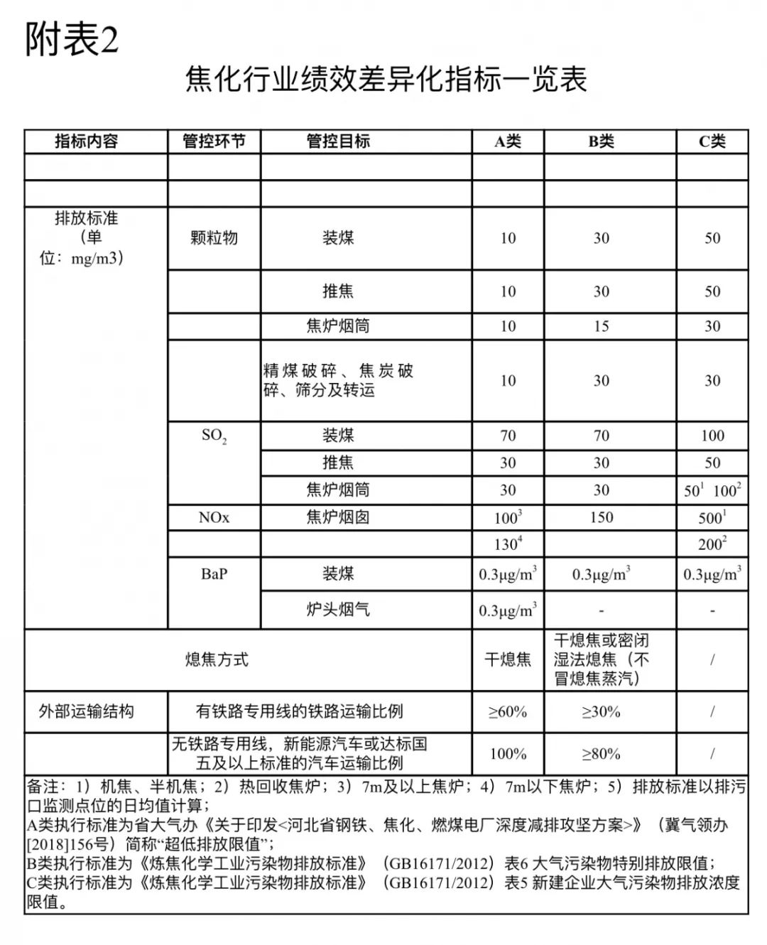 A類:完成超低排放改造并通過驗收,所有污染物穩(wěn)定達(dá)到省大氣辦《關(guān)于印發(fā)<河北省鋼鐵、焦化、燃煤電廠深度減排攻堅方案>》(冀氣領(lǐng)辦〔2018〕156號)中規(guī)定限值;熄焦方式為干熄焦;鐵路運輸比例達(dá)到60%及以上(或新能源汽車、國五及以上標(biāo)準(zhǔn)汽車運輸比例達(dá)到100%)。達(dá)到該類目標(biāo)的焦?fàn)t,不予錯峰。