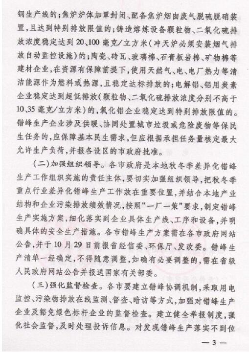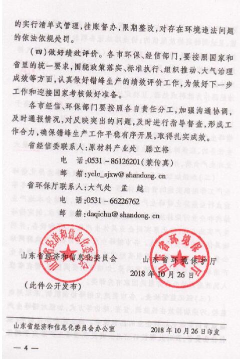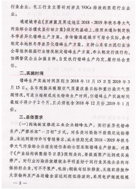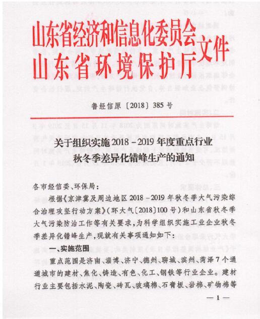 10月26日,山東省經(jīng)濟(jì)和信息化委員會(huì)、山東省環(huán)保廳聯(lián)合下發(fā)《關(guān)于組織實(shí)施2018-2019年度重點(diǎn)行業(yè)秋冬季差異化錯(cuò)峰生產(chǎn)通知》,主要內(nèi)容為: