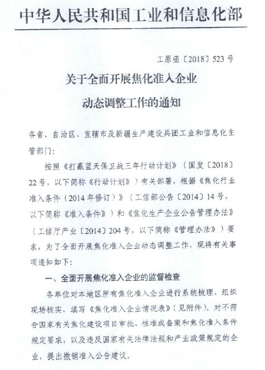 日前,工信息部原材料工業(yè)司印發(fā)《關(guān)于全面開展焦化準(zhǔn)入企業(yè)動(dòng)態(tài)調(diào)整工作的通知》(工原函〔2018〕523號(hào))。