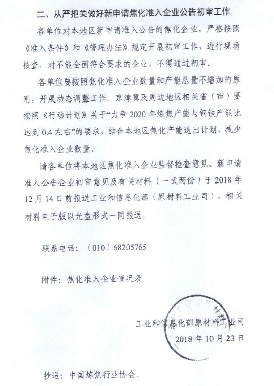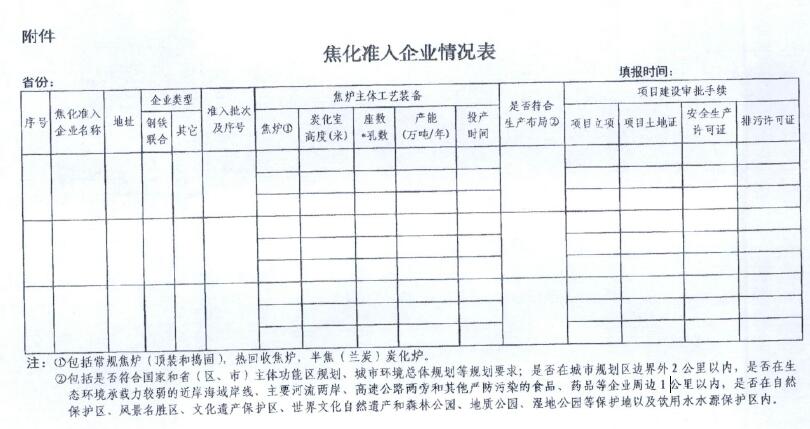 通知要求,各單位對(duì)本地區(qū)現(xiàn)有焦化準(zhǔn)入企業(yè)開展全面復(fù)查,對(duì)不符合國家項(xiàng)目審批、核準(zhǔn)或備案和《焦化行業(yè)準(zhǔn)入條件(2014年修訂)》(工信部公告〔2014〕14號(hào))規(guī)定要求,以及違反國家環(huán)保、安全等法律法規(guī)和產(chǎn)業(yè)政策規(guī)定的企業(yè),提出撤銷準(zhǔn)入公告建議,并填寫《焦化準(zhǔn)入企業(yè)情況表》(附件)。對(duì)本地區(qū)新申請(qǐng)焦化準(zhǔn)入公告企業(yè)進(jìn)行初審,對(duì)不能全面符合要求的企業(yè),不得通過初審。