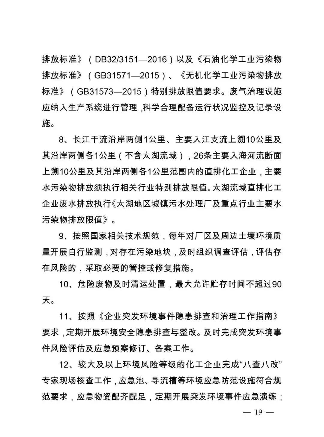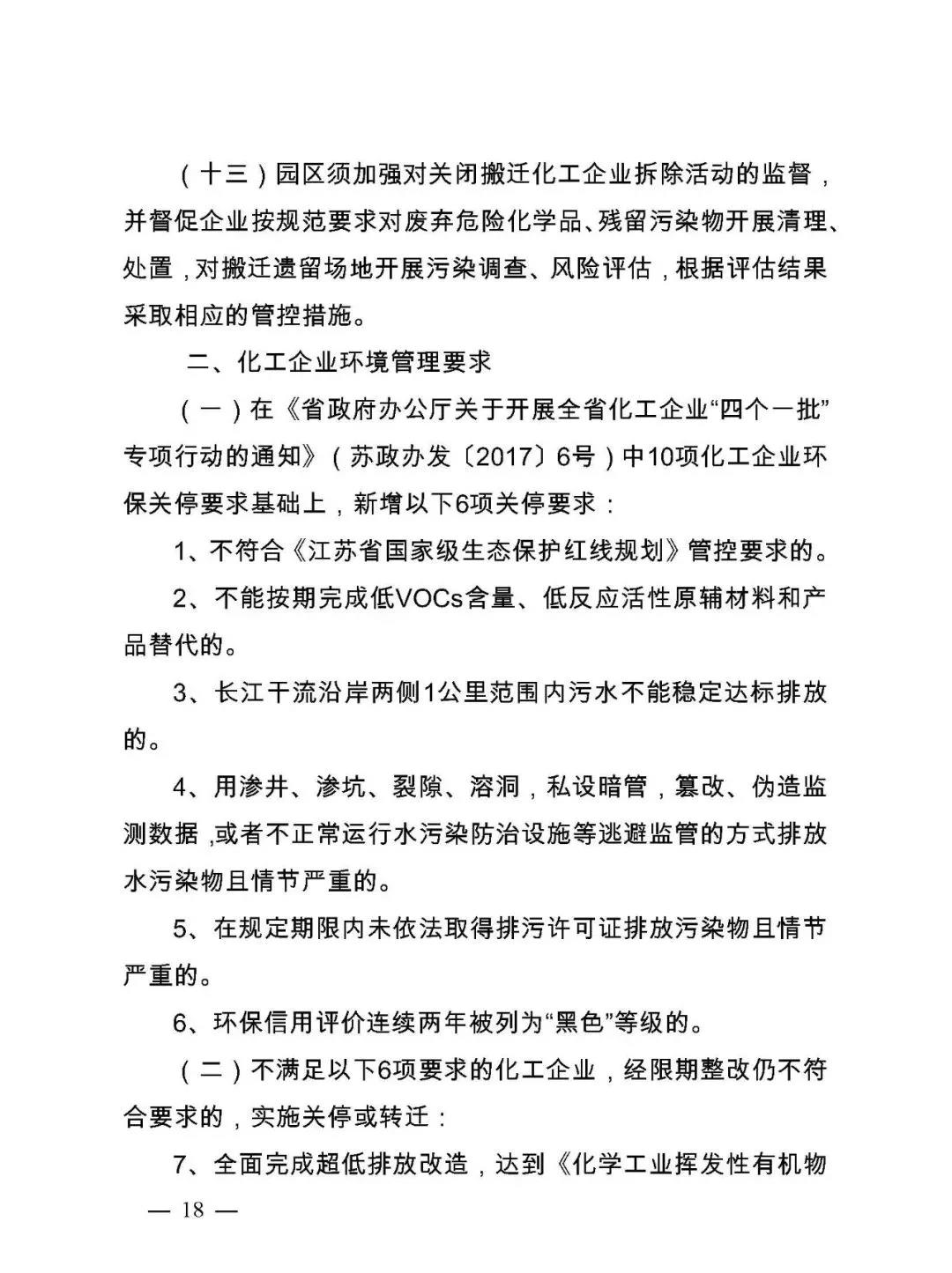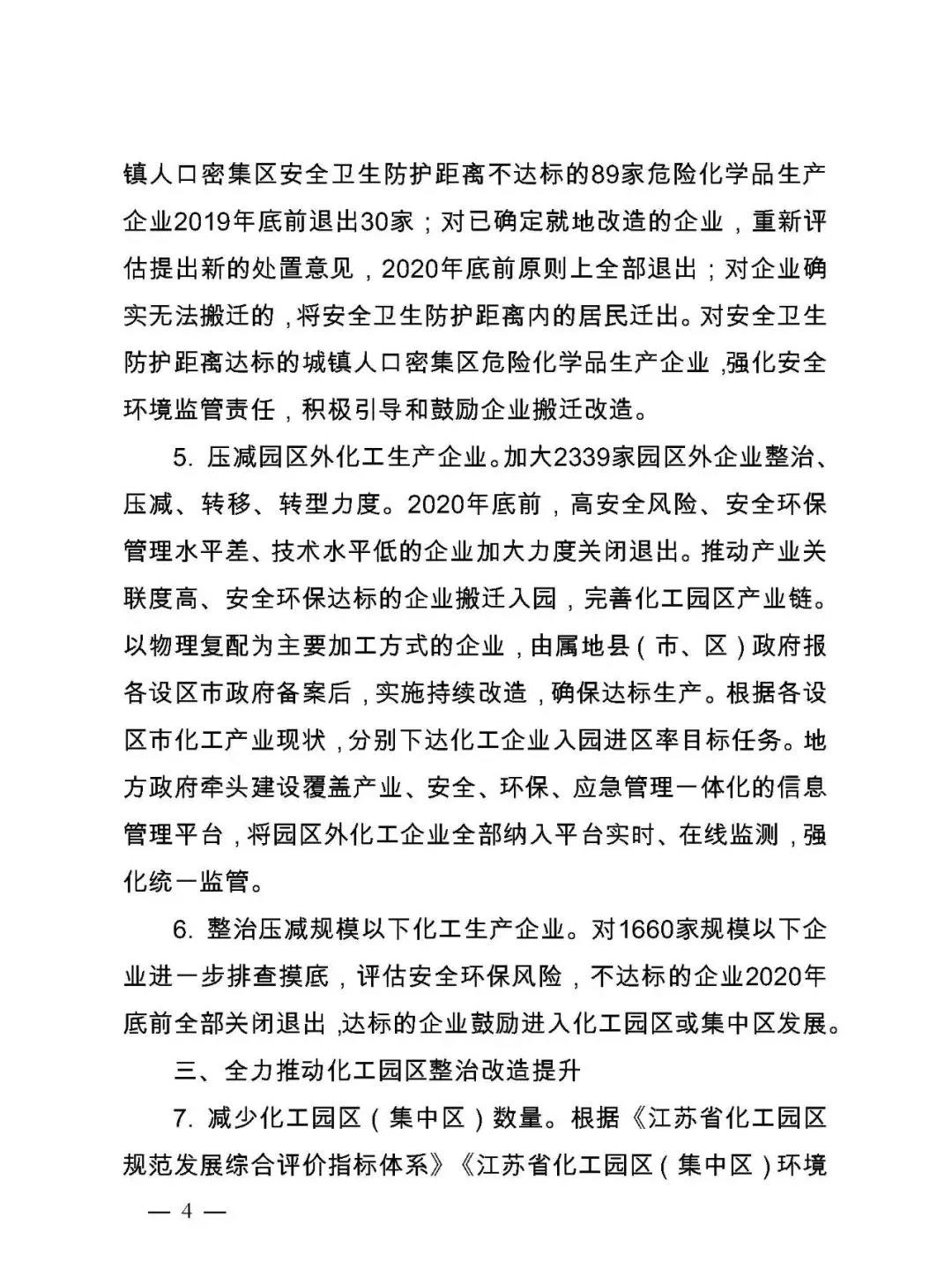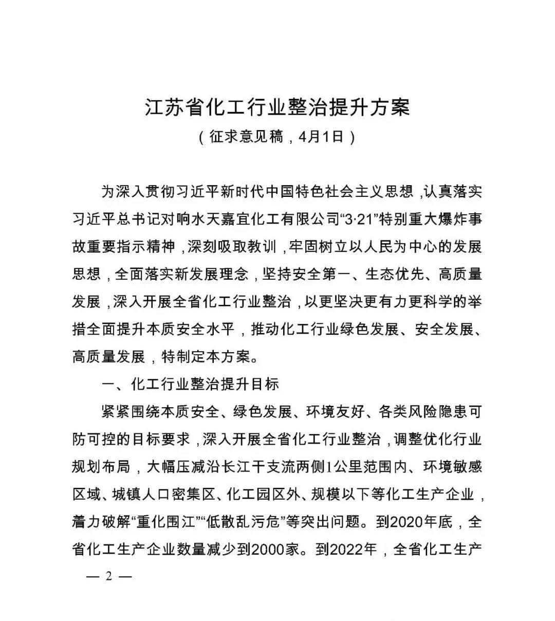 4月1日,江蘇省政府辦公廳下發(fā)了《江蘇省化工行業(yè)整治提升方案(征求意見稿)》(下稱《方案》),該方案擬大幅壓減沿長江干支流兩側(cè)1公里范圍內(nèi)、環(huán)境敏感區(qū)域、城鎮(zhèn)人口密集區(qū)、化工園區(qū)外、規(guī)模以下等化工生產(chǎn)企業(yè)?!斗桨浮芬庖姼逡笕ν苿踊@區(qū)整治改造提升,其中包括減少化工園區(qū)(集中區(qū))的數(shù)量。根據(jù)已提出的和新增加的化工園區(qū)安全、環(huán)保要求,從園區(qū)規(guī)模、產(chǎn)業(yè)層次、用地面積、規(guī)劃許可、安全監(jiān)管、環(huán)境治理等方面,對江蘇全省50個化工園區(qū)開展全面評價,根據(jù)評價結(jié)果,壓減至20個左右。
