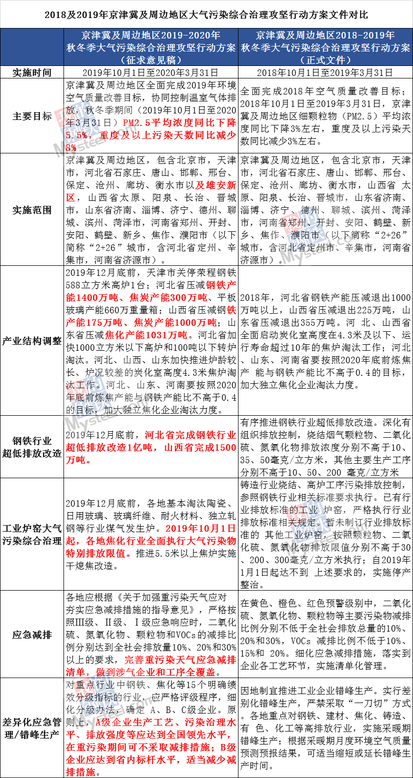 《京津冀及周邊地區(qū)2019-2020年秋冬季大氣污染綜合治理攻堅(jiān)行動(dòng)方案(征求意見稿)》即停工令發(fā)布。對(duì)“京津冀及周邊地區(qū)2019-2020年秋冬季大氣污染綜合治理攻堅(jiān)行動(dòng)方案(征求意見稿)”進(jìn)行了整理,通過與《京津冀及周邊地區(qū)2018-2019年秋冬季大氣污染綜合治理攻堅(jiān)行動(dòng)方案》對(duì)比,有如下重點(diǎn)內(nèi)容發(fā)生了變動(dòng):