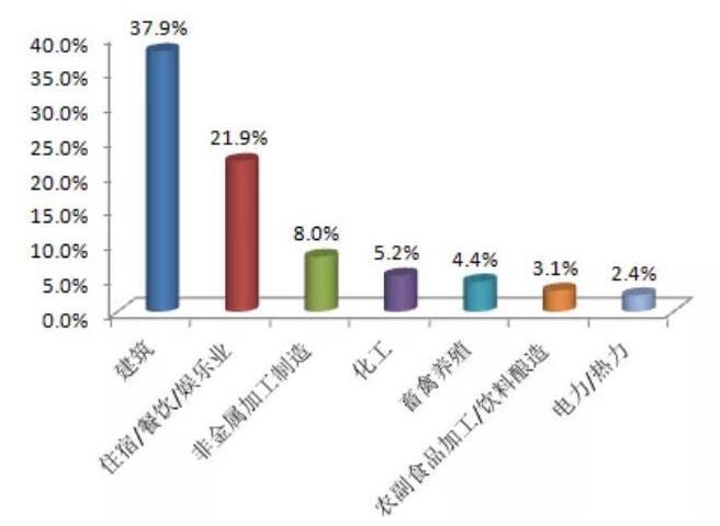 從行業(yè)類型來看,11月公眾反映最集中的行業(yè)是建筑業(yè),占37.9%,其次為住宿餐飲娛樂業(yè)和非金屬加工制造,分別占21.9%和8.0%。其中,建筑業(yè)占比環(huán)比下降約11個(gè)百分點(diǎn),非金屬加工制造業(yè)和化工業(yè)舉報(bào)占比環(huán)比分別約上升2.1和1.4個(gè)百分點(diǎn)。此外,電力熱力業(yè)占比排名攀升至第7名,超過垃圾處理業(yè)。