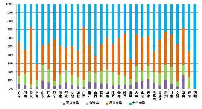 從各省舉報(bào)污染類型占比來看,上海、新疆大氣污染舉報(bào)在當(dāng)?shù)卣急容^高,占比高于全國(guó)平均水平13個(gè)百分點(diǎn),其中上海主要反映工業(yè)廢氣和油煙問題,新疆主要反映惡臭異味問題。重慶、廣西噪聲污染舉報(bào)在當(dāng)?shù)叵鄬?duì)突出,占比超過全國(guó)平均水平近20個(gè)百分點(diǎn),兩地主要反映建筑施工噪聲問題。甘肅、山東、貴州、吉林水污染舉報(bào)在當(dāng)?shù)卣急容^高,超過全國(guó)平均水平約5.5個(gè)百分點(diǎn)。