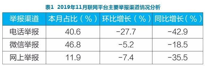 2019年11月聯(lián)網(wǎng)平臺(tái)主要舉報(bào)渠道情況分析