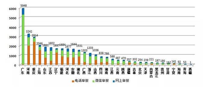 從各地區(qū)不同渠道舉報(bào)數(shù)量看,廣東、河南、重慶等地舉報(bào)量居前,重慶、河南、上海等地電話舉報(bào)占比較高,廣東、江蘇、廣西等地微信舉報(bào)占比較高。