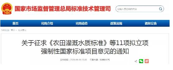 經(jīng)研究,國家標(biāo)準(zhǔn)委決定對《農(nóng)田灌溉水質(zhì)標(biāo)準(zhǔn)》等11項(xiàng)擬立項(xiàng)強(qiáng)制性國家標(biāo)準(zhǔn)項(xiàng)目公開征求意見,征求意見截止時(shí)間為2020年7月15日。