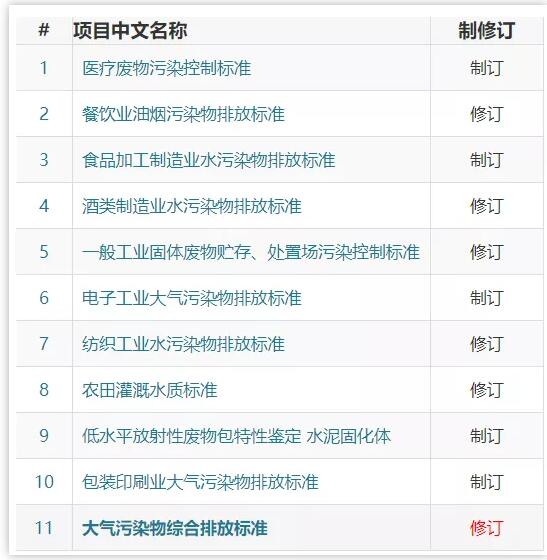國家市場監(jiān)督管理總局對《大氣污染物綜合排放標(biāo)準(zhǔn)》(GB16297-1996)等11項(xiàng)環(huán)保強(qiáng)制性國標(biāo)擬立項(xiàng)修訂征求意見。詳情如下: