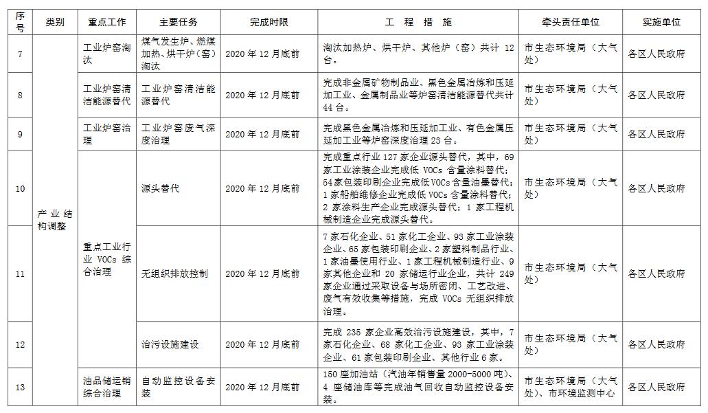 一、職責(zé)分工。我局根據(jù)《上海市清潔空氣行動計劃(2018-2022年)》以及減煤、減硝、治柴、消重等專項(xiàng)行動的既有任務(wù)分工,對《行動方案》中涉及本市的35條任務(wù)進(jìn)行了職責(zé)分工,并形成《上海市2020-2021年秋冬季大氣污染綜合治理攻堅行動任務(wù)清單》(詳見附件)。