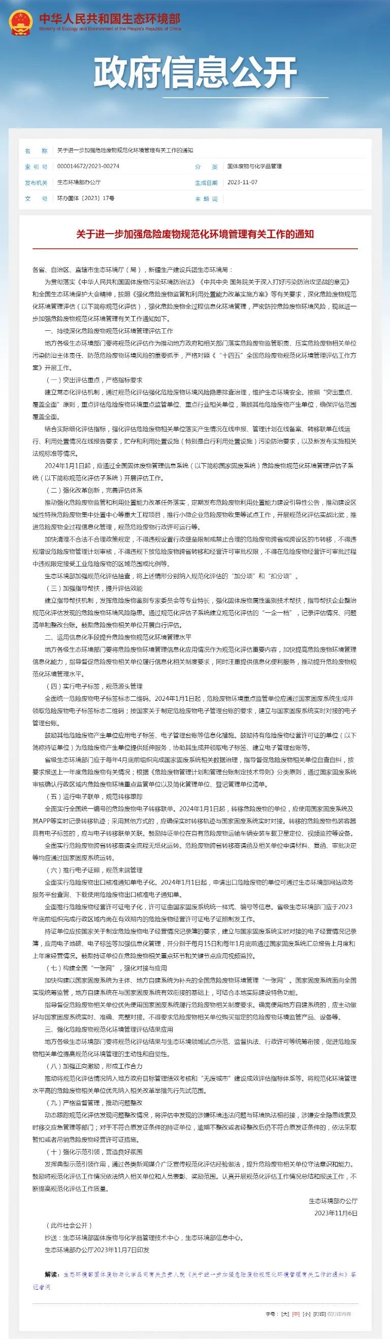 為此,生態(tài)環(huán)境部制定《通知》,深化規(guī)范化評估工作,強化全過程信息化環(huán)境管理,持續(xù)提升危險廢物規(guī)范化環(huán)境管理水平,嚴密防控危險廢物環(huán)境風險。