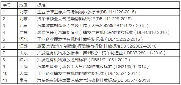 汽車制造業(yè)有機(jī)廢氣的產(chǎn)生主要集中于涂裝工序,而涂裝過程中VOCs則主要產(chǎn)生于電泳底漆、中涂和面漆的噴涂及烘干過程、塑料件加工的涂漆工序。在中涂和面漆噴漆過程中,約80-90%的VOCs是在噴漆室和流平室排放,10-20%的VOCs排放是隨車身涂膜在烘干室中排放。汽車涂裝產(chǎn)生的有機(jī)廢氣具有大風(fēng)量、中低濃度的特點(diǎn)。汽車制造業(yè)VOCs管控受到地方環(huán)保局的極大重視,北京、上海、重慶、廣東、江蘇、山東出臺了汽車行業(yè)專項排放標(biāo)準(zhǔn),天津、河北、陜西在綜合排放標(biāo)準(zhǔn)中也對汽車行業(yè)提出明確要求。前沿君梳理了最新的各地方標(biāo)準(zhǔn)限值要求,整理并分享給大家。