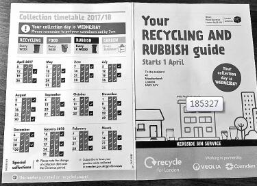 對于垃圾分類和垃圾回收時間,區(qū)政府給每個家庭都印制了專門的小冊子。由于沒有“讀懂吃透”區(qū)政府的“垃圾回收指南”,記者在倫敦生活的第一周便被工人拒收垃圾。上門回收垃圾的工人,在記者盛放可回收垃圾的綠色垃圾桶上,留下了一張拒收垃圾的說明,上面寫道:“由于您的垃圾桶內放置了不可回收使用的物品,我們無法回收,請您遵照以下說明,重新清理垃圾桶內物品。”