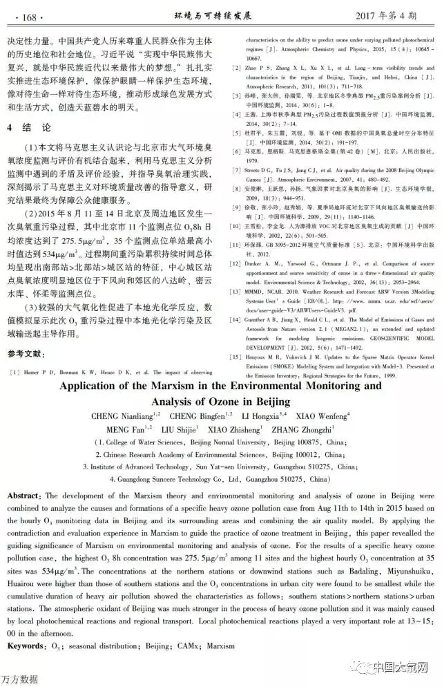 近日,北京師范大學(xué)水科學(xué)研究院程念亮等8人在2017年04期(8月10日)的《環(huán)境與可持續(xù)發(fā)展》期刊上發(fā)表了題為《馬克思主義在北京市臭氧檢測及分析中的應(yīng)用》的論文。