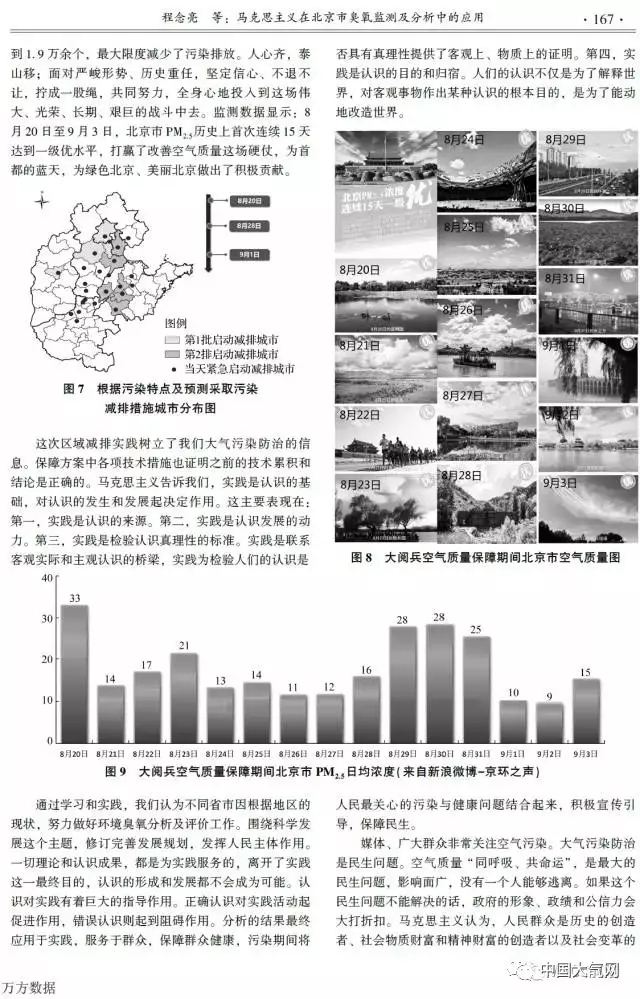 在第三部分“北京市臭氧治理和實(shí)踐中”,論文用馬克思主義實(shí)踐和認(rèn)識(shí)觀總結(jié)了針對(duì)2015年抗戰(zhàn)勝利70周年大閱兵的減排實(shí)踐:“這次區(qū)域減排實(shí)踐樹立了我們大氣污染防治的信息。保障方案中各項(xiàng)技術(shù)措施也證明之前的技術(shù)累積和結(jié)論是正確的。馬克思主義告訴我們,實(shí)踐是認(rèn)識(shí)的基礎(chǔ),對(duì)認(rèn)識(shí)的發(fā)生和發(fā)展起決定作用。”