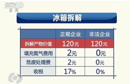以冰箱為例,平均拆解一臺冰箱能產(chǎn)生120元的拆解產(chǎn)物,非法拆解的私人作坊只要電費(fèi)1元、人工費(fèi)2元,而正規(guī)的廢棄電器電子產(chǎn)品處理企業(yè)要承擔(dān)電費(fèi)4元、人工費(fèi)5元、配件費(fèi)2元、氮?dú)赓M(fèi)用2元、危廢處理費(fèi)2元和17%的稅。因此,同樣一臺冰箱,正規(guī)的廢棄電器電子產(chǎn)品回收企業(yè)的回收價格要低于85元,而非法拆解的私人作坊卻只要低于117元就可以收。
