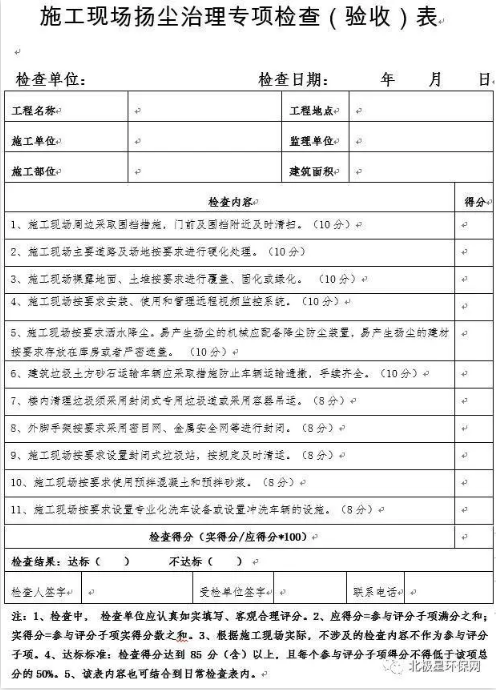 7.施工現(xiàn)場揚塵治理檢查標準統(tǒng)一參照《施工現(xiàn)場揚塵治理專項檢查(驗收)表》(見附件),檢查得分達到85分(含)以上,且每個參與評分子項得分不得低于該項總分的50%即為達標,低于上述標準為不達標。