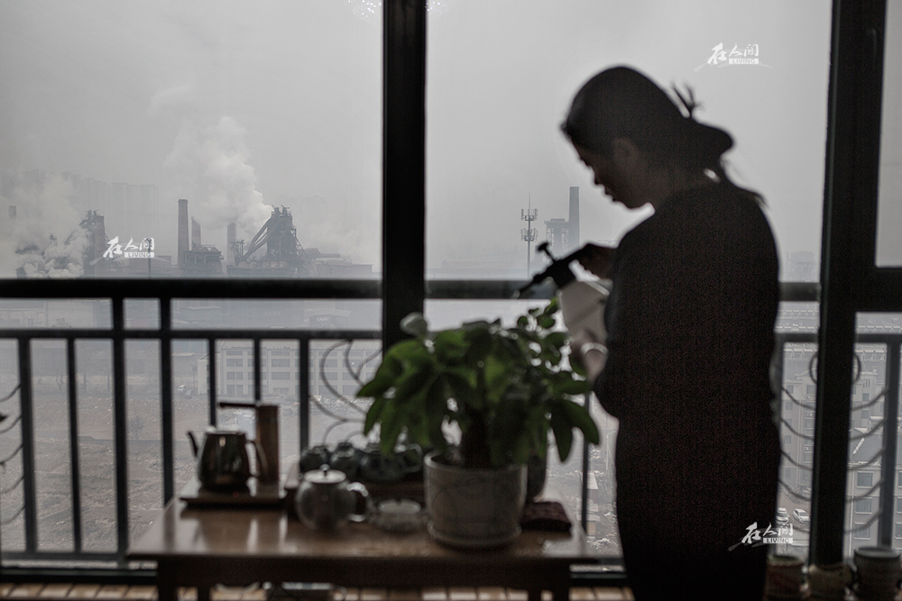 因為污染嚴重,廠區(qū)附近的居民平時在家里都不敢開窗戶,否則屋里很快就會覆蓋上一層棕紅色的粉塵,沾染到衣服上很難洗凈。圖為2016年12月,徐女士給花卉澆水,窗外的球墨廠在冒著濃煙。