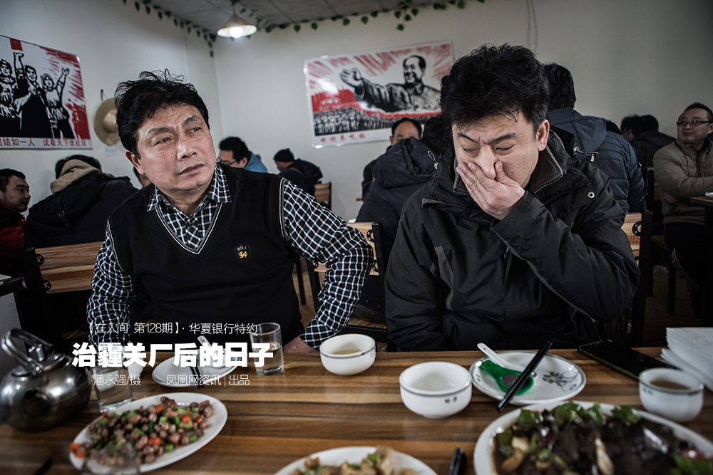 2016年12月26日,工廠被關停前夕,工人宋巍(右)與選擇內退的李賢和吃散伙飯,聊到動情處,已決定去蘭陵新廠區(qū)工作的他捂住了臉。因污染排放問題,他們所在的山東球墨鑄鐵管有限公司停產搬遷。當“去產能、治霧霾”的抽象口號落實到現實層面,被綁在霧霾制造鏈條上的他們,命運亦隨之發(fā)生劇變。潘永強/攝