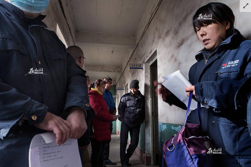 工廠搬遷的背后,數千名工人的生活將因此發(fā)生變化。與外界對搬遷的一致叫好不同,工人們的心情比較復雜。“我們?yōu)槌鞘邪l(fā)展做出了犧牲。”47歲的職工李師傅說,“目前企業(yè)在幫著職工聯系應聘,要是選擇自謀出路,可以獲得近20多萬元的補償金。但我這個歲數只能選擇保安之類的工作,自己創(chuàng)業(yè)又沒有經驗……我在工廠快30年了,真舍不得離開。”李師傅最終選擇了去偏遠的新廠區(qū)。圖為2016年12月29日,球墨廠動力車間的主任辦公室門外,職工們排隊領取搬遷分流安置方案。