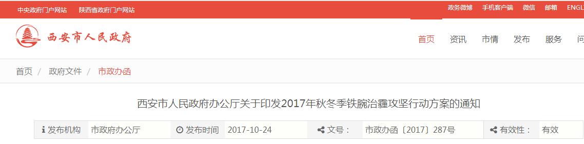 西安市人民政府辦公廳關(guān)于印發(fā)2017年秋冬季鐵腕治霾攻堅行動方案的通知
