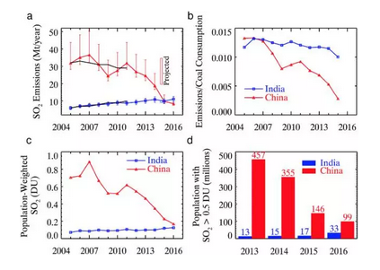 2007年是中印兩國的分水嶺,在此之前,兩國對二氧化硫的控制力度都很小。2007年后,中國采取了有效的控制措施,消除了約80%的潛在二氧化硫排放。