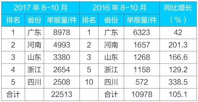 2017年8-10月微信舉報前五的省份舉報量及同比情況