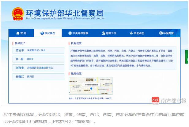 南都記者注意到,環(huán)保部網(wǎng)站的“機(jī)構(gòu)職能”介紹已相應(yīng)修改,6個(gè)區(qū)域督察局出現(xiàn)在“派出機(jī)構(gòu)”一欄。各督察局網(wǎng)站也已更名,有的還更換了網(wǎng)站域名。