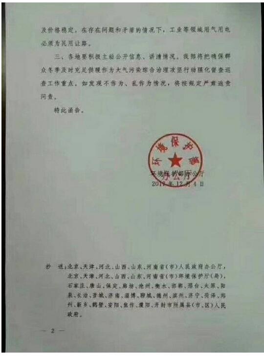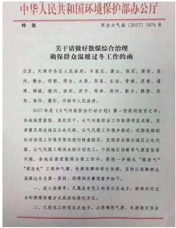 據(jù)《能源》記者了解,為了應(yīng)扭轉(zhuǎn)這一“窘境”,兌現(xiàn)采暖承諾,環(huán)保部于12月4日向京津冀及周邊地區(qū)“2+26”城市正式下發(fā)《關(guān)于請做好散煤綜合治理確保群眾溫暖過冬工作的函》特急文件,以解決部分地區(qū)以電代煤、以氣代煤工程尚未按計(jì)劃完工,個別地區(qū)供暖季氣源緊張等問題。