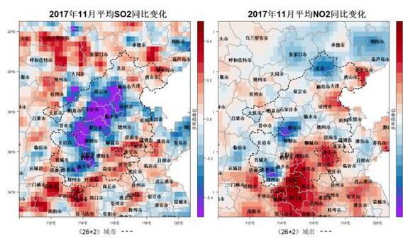 “2+26”城市2017年11月SO2及NO2平均濃度同比變化