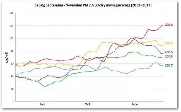 北京同期9月至11月PM2.5濃度30日移動(dòng)平均值對(duì)比(2013-2017)圖片來自:綠色和平