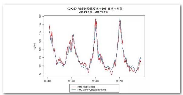 “2+26”城市污染濃度水平30日移動(dòng)平均值(2014年1月-2017年11月)與PM2.5基于氣象因素的預(yù)測(cè)值之間的數(shù)據(jù)比較。圖片來自:綠色和平