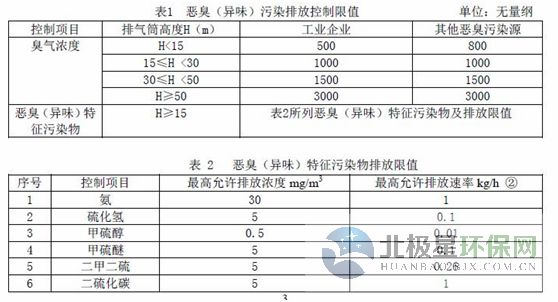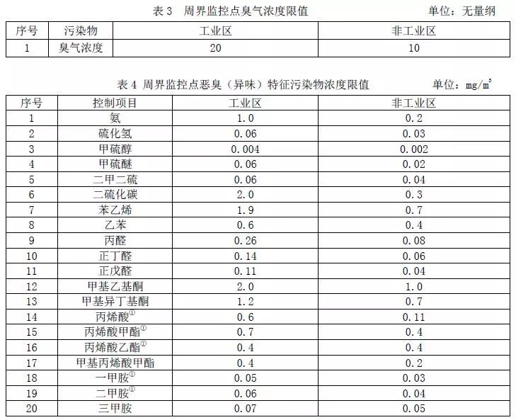 現(xiàn)有源自2018年7月1日起,新源自2017年2月1日實施之日起,周界監(jiān)控點的臭氣濃度限值和惡臭特征污染物的濃度限值應分別符合表3規(guī)定和表4的規(guī)定。