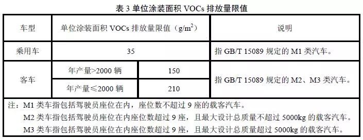 單位涂裝面積VOCs排放量限值應符合表3規(guī)定。