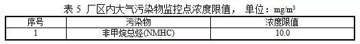 廠區(qū)內(nèi)大氣污染物監(jiān)控點濃度限值執(zhí)行表5中廠區(qū)內(nèi)大氣污染物監(jiān)控點濃度限值。