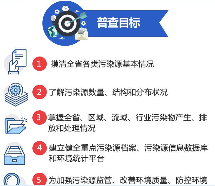 此次普查旨在摸清全省各類(lèi)污染源基本情況、數(shù)量、結(jié)構(gòu)和分布狀況,掌握全省、區(qū)域、流域、行業(yè)污染物產(chǎn)生、排放和處理情況,建立健全重點(diǎn)污染源檔案、污染源信息數(shù)據(jù)庫(kù)和環(huán)境統(tǒng)計(jì)平臺(tái),為加強(qiáng)污染源監(jiān)管、改善環(huán)境質(zhì)量、防控環(huán)境風(fēng)險(xiǎn)、服務(wù)環(huán)境與發(fā)展綜合決策提供依據(jù)。