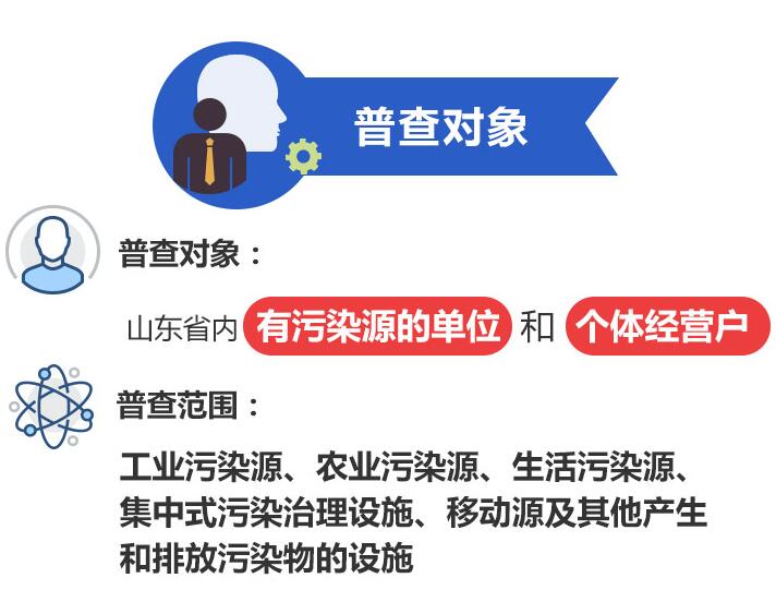 普查對(duì)象為山東省內(nèi)有污染源的單位和個(gè)體經(jīng)營(yíng)戶(hù)。范圍包括:工業(yè)污染源,農(nóng)業(yè)污染源,生活污染源,集中式污染治理設(shè)施,移動(dòng)源及其他產(chǎn)生、排放污染物的設(shè)施。