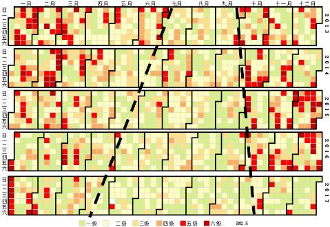 (2013-2017年P(guān)M2.5空氣質(zhì)量級別日歷圖分布)